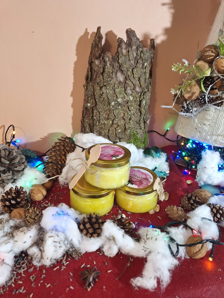 *Barojošs cukura skrubis ar citrona, citronzāles un tangerīna ēteriskajām eļļām.*Himalaju sāls ar rozes un lavandas ēteriskajām eļļām,